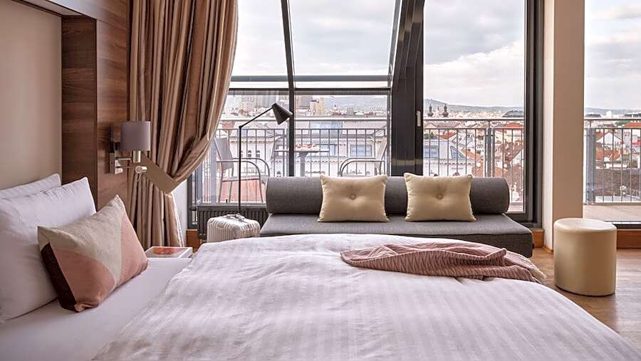 This spacious air-conditioned room on the top floor features a balcony with a panoramic view of Vienna. It also comes with free WiFi, a Coffee Machine, satellite TV as well as a laptop safe, telephone, desk and a bathroom with shower.